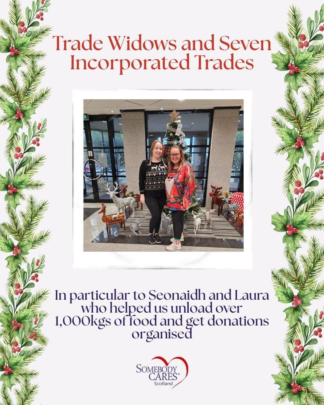 Somebody Cares Aberdeen is a long‑established local charity, founded in 2002, dedicated to supporting people across the city who are experiencing hardship. It provides free food, furniture, clothing, and essential household items to individuals and families in crisis, while also running a busy foodbank and a large-scale donation and redistribution operation. The organisation focuses on dignity, empathy, and practical help—furnishing homes, reducing food poverty, offering reintegration support, developing volunteers, and preventing usable goods from going to landfill. Its work is rooted in the belief that the best way to help a city is to love it, and that everyone deserves comfort, respect, and a fresh start. On the day, an incredible 1000kgs of food was moved and donations organised just ahead of Christmas. It was both heart warming and amazing to see the impact that Somebody Cares has on the community. Pictured: PR and Development Manager for the Charity Seonaidh Baker Operations Administrator Laura McLean